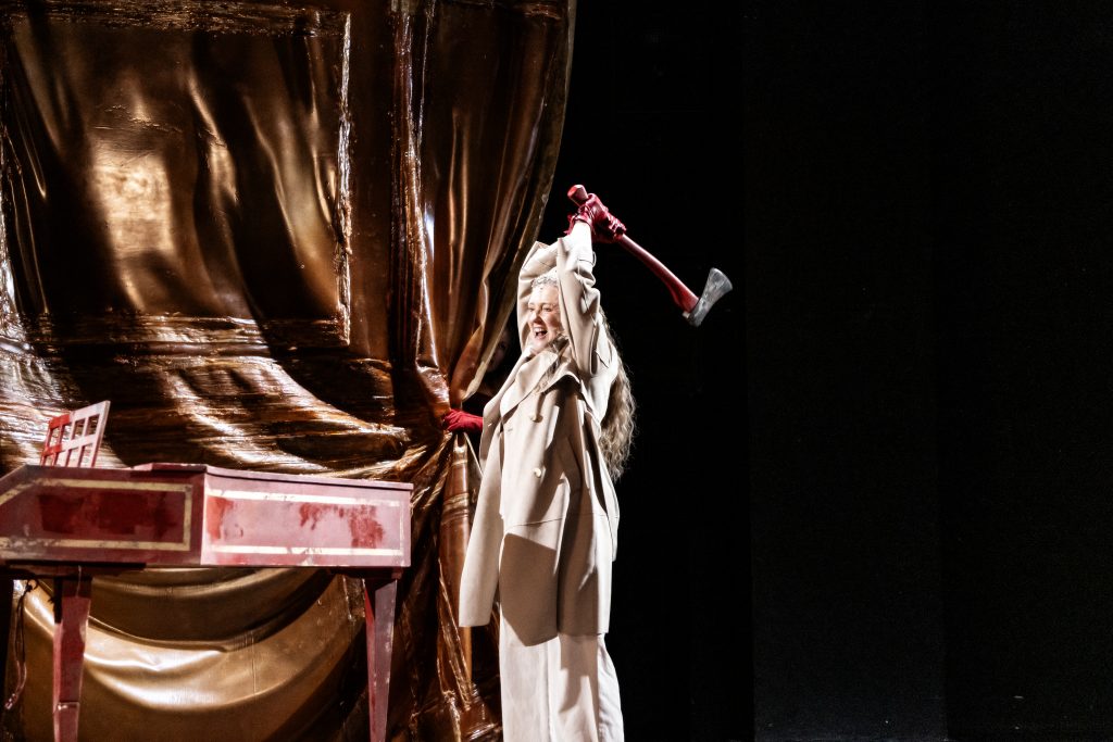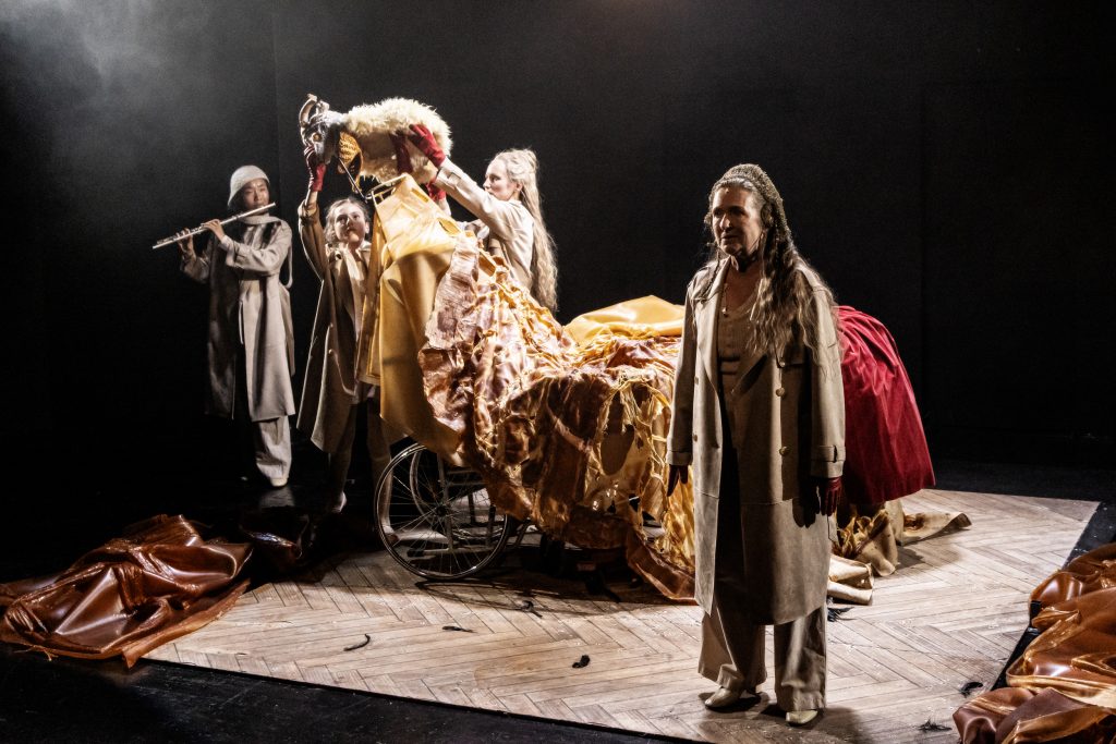 In einem häuslichen Raum, der zugleich Erinnerungsraum ist, findet sich Judith wieder zwischen väterlicher Übermacht, Carearbeit und der Aufgabe, den Stammbaum weiterzuführen. Schauspielerin, Sängerin und Musiker*innen verbinden ihre Stimmen und evozieren fantastische Bilder und die Möglichkeit einer Befreiung.